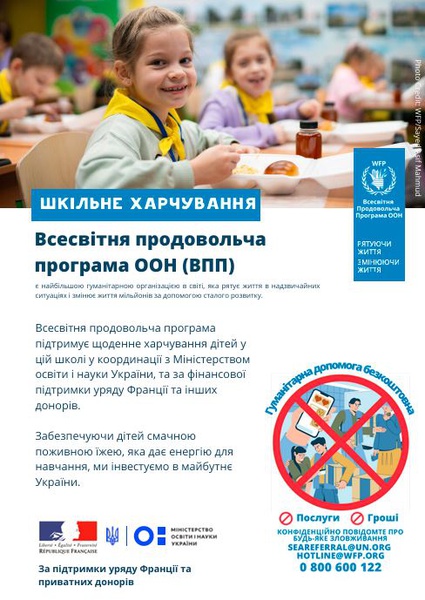 Всесвітня продовольча програма ООН— це провідна гуманітарна організація, яка за підтримки міжнародних донорів сприяє забезпеченню дітей та вразливих груп населення якісним харчуванням у різних країнах світу. Наш заклад освіти є учасником Програми шкільного харчування Всесвітньої продовольчої програми ООН. У межах цієї програми всі учні початкових класів нашої школи щоденно отримують фінансову підтримку на організацію повноцінного гарячого обіду, що сприяє забезпеченню доступу дітей до якісного та збалансованого харчування.